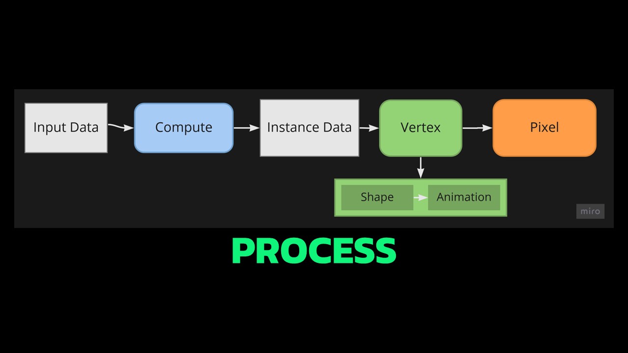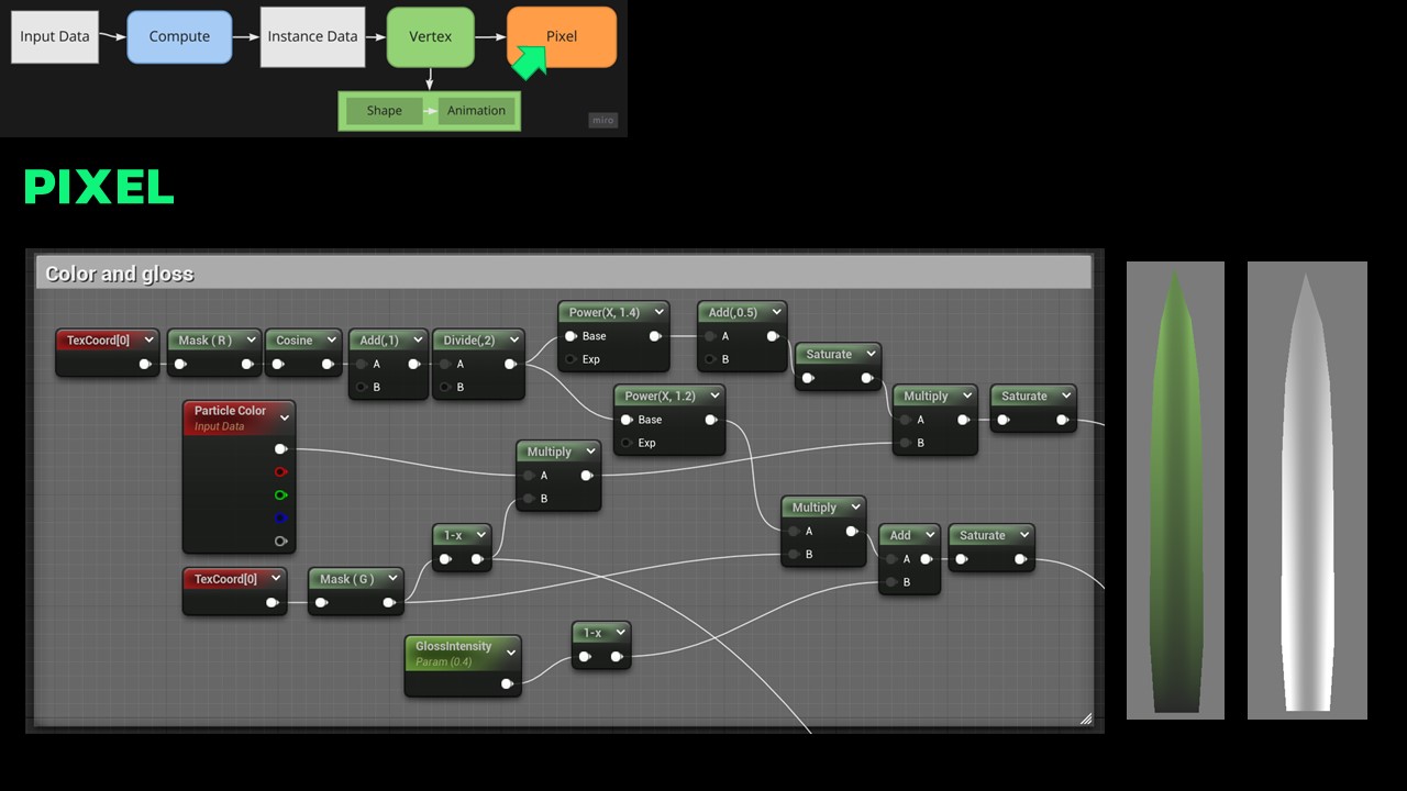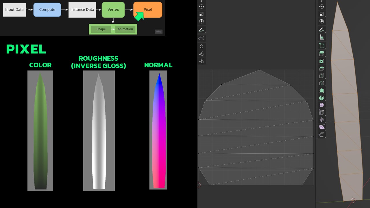 The journey of each grass blade towards rendering involves several steps, outlined in the slides. Initially, there’s input data transformed through compute shader into an instance data fed into vertex and pixel shaders.