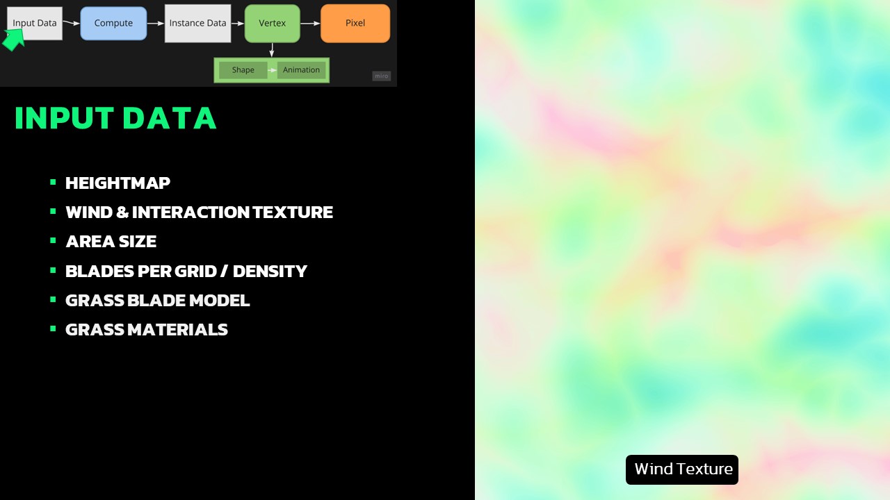 The first phase involves input data, adaptable to specific project needs. For instance, I use a height map to determine grass placement, along with wind and interaction textures to ensure interactivity. Parameters like area size (how much space the grass covers) and spawn count (density) are standardized. Additionally, requisite elements like models and materials are essential.