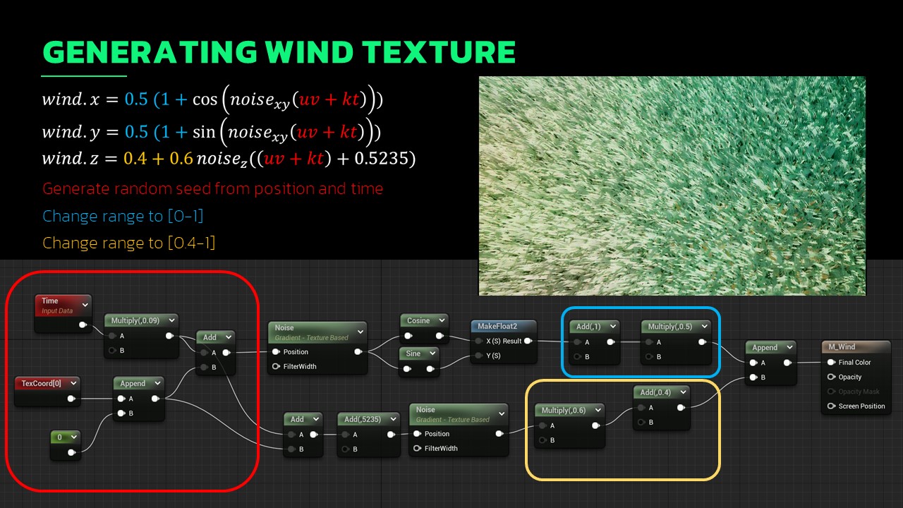 I have also created wind texture in Unreal. This texture is easily created by using a sequence of blocks driven by texture coordinates and time values. Despite wind being 2D, I use the Z coordinate to be wind strength at each position. It’s fascinating amazing how a few noise blocks and some manipulation can make a great-looking wind texture, perfect for animating grass in your material.