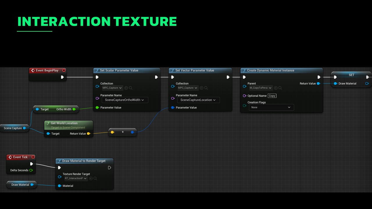 To allow interaction, I use standard render target textures. Placing the camera below ground level, I render the player’s feet onto this texture. This process captures the player’s position, enabling me to animate the grass by flattening it based on this data. The biggest benefit of this technique is its scalability; it handles multiple entities efficiently yet renders fast.