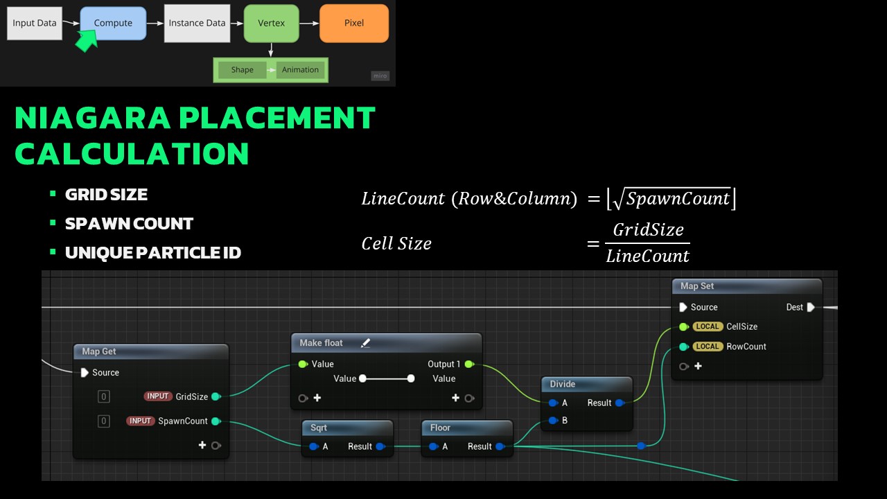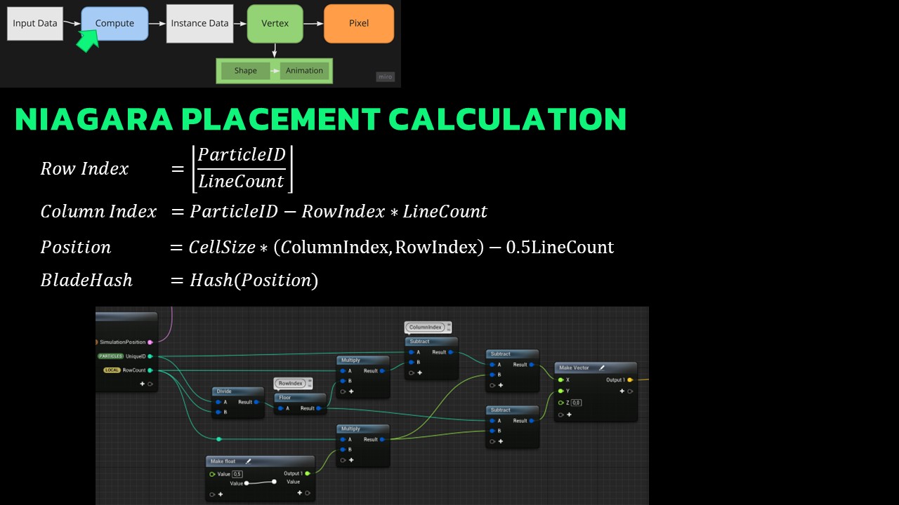 Our goal with the compute shader is to achieve a uniformly distributed grass layout in a grid pattern, allowing for slight variations to impart a natural appearance. Parameters such as grid size, spawn count, and unique particle IDs provided by Niagara influence our calculations. The logic behind these computations resembles the layout of blueprints or material editors, making it easier to understand.