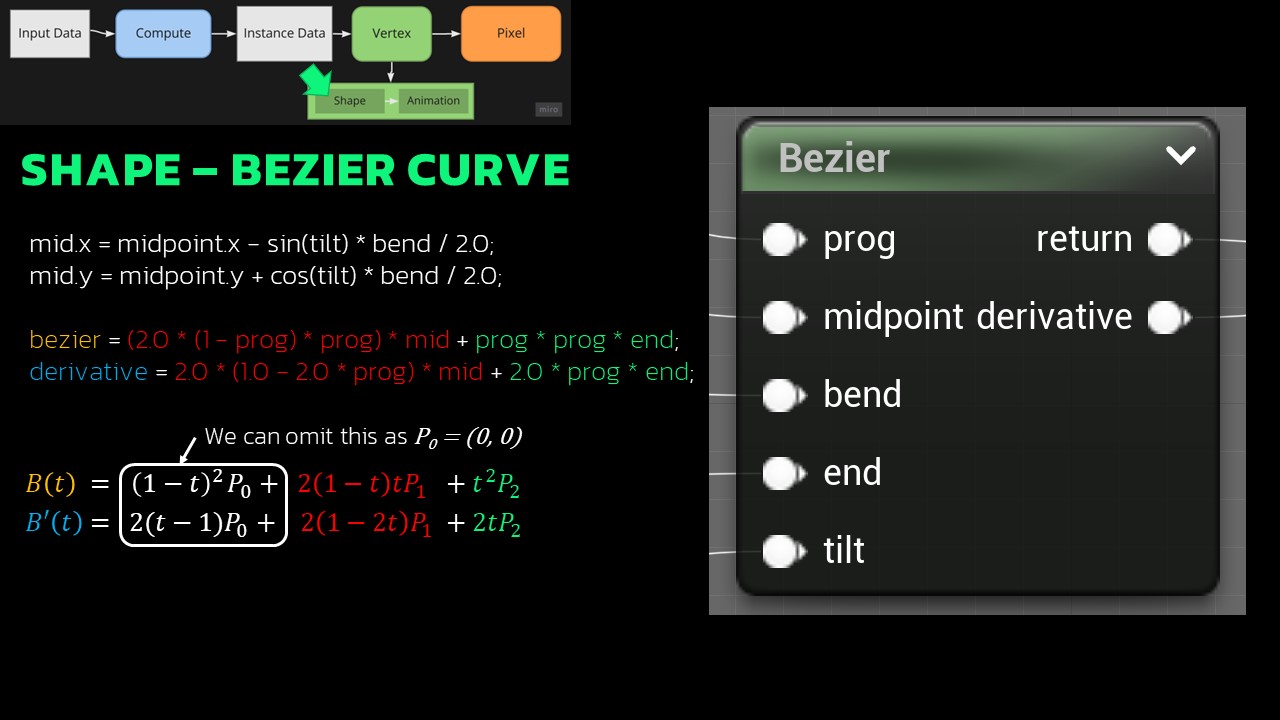 Calculating the Bézier curve involves defining the first point at the grass base (position 0;0) within a 2D space, disregarding the third dimension for simplicity. The endpoint is calculated using tilt and height parameters. The middle point is found between the start and end points, offset by the bend parameter. This technique, relying on linear interpolations, proves efficient and cost-effective. Its simplicity also enables straightforward derivative calculations.