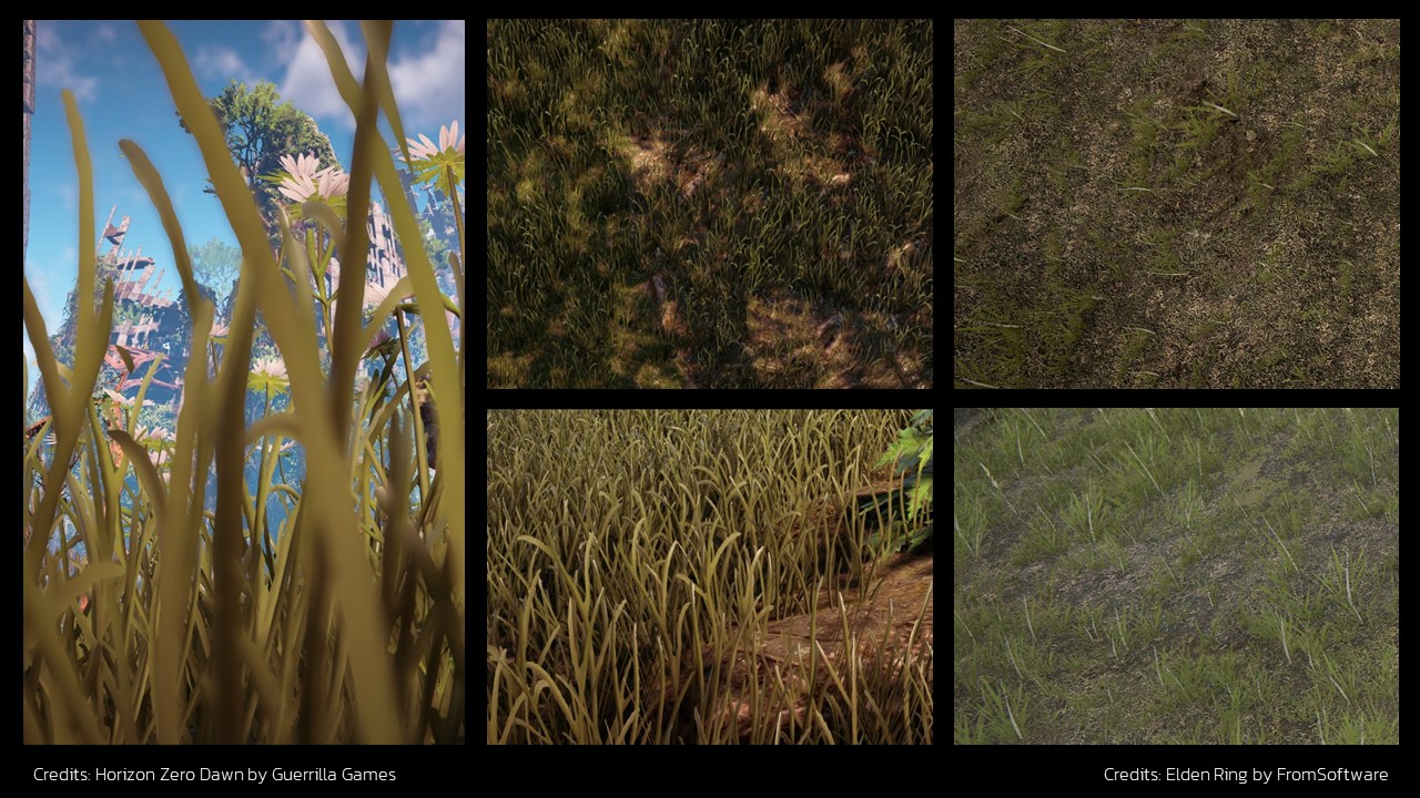 Games usually use flat planes with a grass texture for their grass. These can be simple squares or more detailed shapes. You can see examples of them in games like Horizon Zero Dawn and Elden Ring. While you might not see problems at first, looking closely shows issues like intersecting lines, limited light effects, strange movements, and grass disappearing when seen from above. These are things we’re used to with this method.