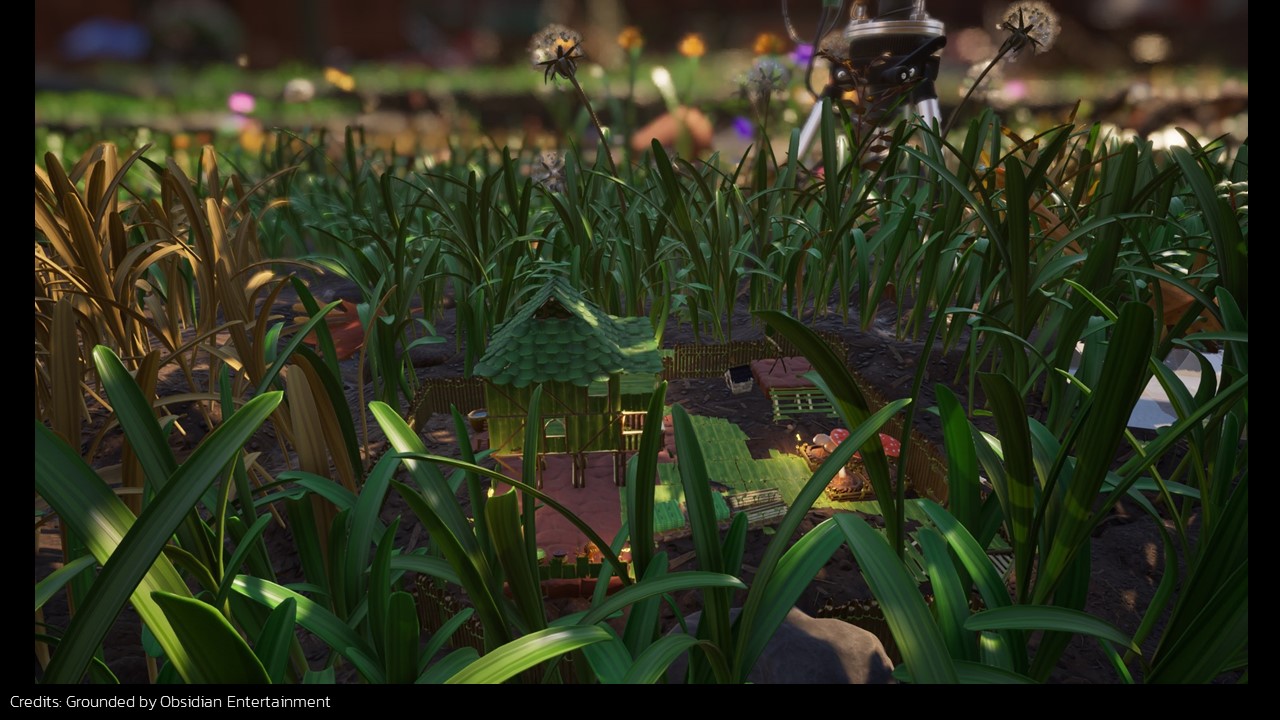 Let’s talk about the newer approach called per-blade mesh grass. Games such as Ghost of Tsushima, Genshin Impact, and Zelda: Breath of the Wild were the ones to already use this technique. It gives denser grass that responds better to light. Grounded, a game I love, does something similar, treating each grass blade as its own entity with its own mesh, creating a visually striking effect.